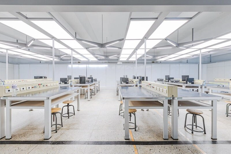 瑞芳高工校長郭昱晨接受中央社記者訪問表示,學校創校逾90年,見證技術教育變遷,電子電路操作須嚴謹而細緻,要全神貫注在桌面上的檢視、組裝、焊接、測試。此次,透過更新空間改造整合用電設備,打造雙層操作檯面,兼顧資訊顯示與操作彈性,提升學習效率。