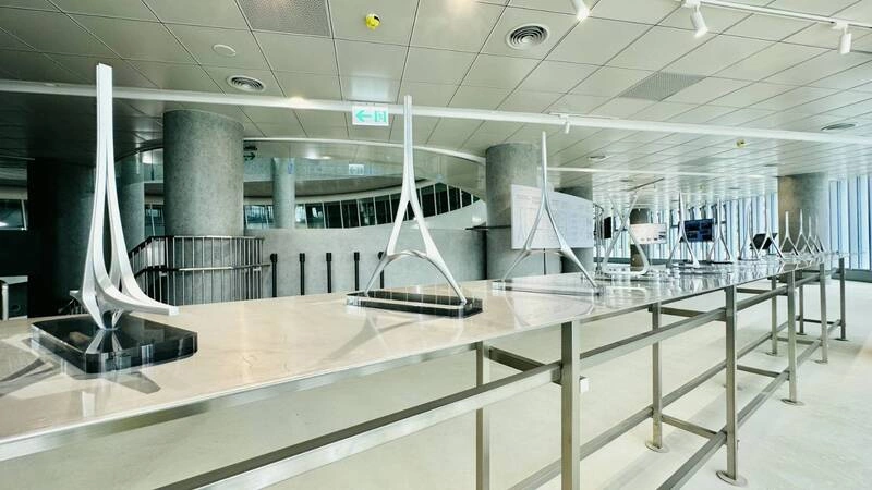 公路局指出,淡江大橋的設計形態語言,源自舞者之美、夕陽之美以及雙手合十的祈福之美,特展以1樓至3樓的垂直敘事架構,帶領觀者從宏觀環境到微觀細節,透過數位動態圖,讓民眾體驗橋面的景觀燈桿的光影姿態、動態韻律,既是結構力學的最適解,也構成一幅在淡水河口每日上演的動態畫面,循序進入設計思維及工程實踐的核心。