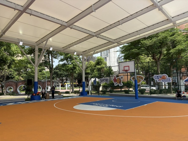(中央社記者曹亞沿新北21日電)位於四號公園、新北中和首座天幕籃球場今天正式啟用,天幕採薄膜材質及單斜式設計,可阻隔紫外線、降低西曬高溫,同時加裝燈組加強夜間照明,讓球友不必再看天氣臉色打球。