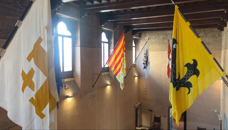 走進協會,迎賓處是深具歷史意義的「旗幟大廳」,這裡陳列了象徵騎士團以8種「古語言系統」分組的旗幟。狄羅比亞特解釋,馬爾他騎士團在中世紀統治羅德島(Rodi)時期,前往騎士團效力的顯赫家族來自歐洲各地,為了方便作戰溝通,騎士團將成員依語言系統分組,「有些歷史學家稱這種跨國合作宛如歐盟雛形。」