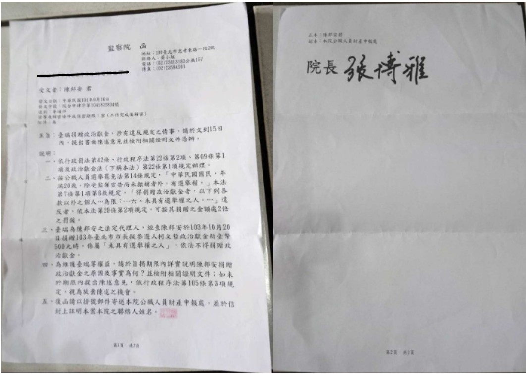 陳邦安解釋,當時監察院在選舉結束後,開始調查柯文哲是否「在選舉期間收受未成年人捐款」,自己只是購買柯文哲的兩本書,並不是直接捐錢給他,卻也收到監察院公文,希望可以進一步說明。後來與曾任教文化大學的姚立明先生討教,詢問過相關意見後,這件事情就不了了之。陳邦安也說,當時也有父親以小孩名義捐款的爭議,所以並不是只有自己被調查。