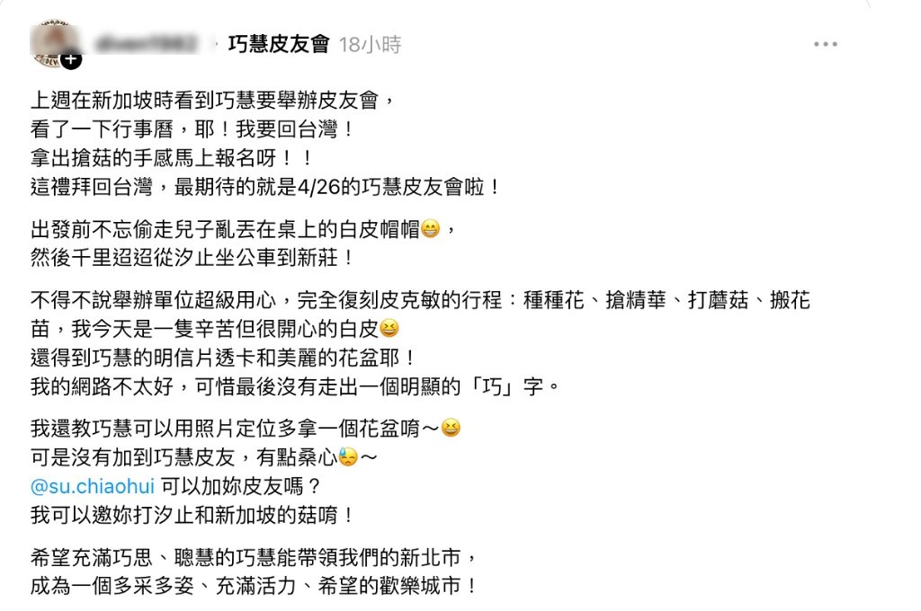 網友diven表示,不得不說舉辦單位超級用心,完全復刻皮克敏的行程:種種花、搶精華、打蘑菇、搬花苗,「我今天是一隻辛苦但很開心的白皮」,還得到巧慧的明信片透卡和美麗的花盆!「希望充滿巧思、聰慧的巧慧能帶領我們的新北市,成為一個多采多姿、充滿活力、希望的歡樂城市!」