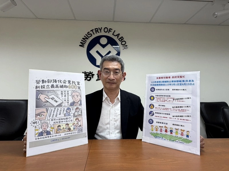 勞動部今天舉行例行業務報告,勞動部勞動福祉及退休司司長黃維琛會中表示,「企托333 政府來幫忙」企業托育補助新制5月1日正式上路,6月15日前受理企業申請。