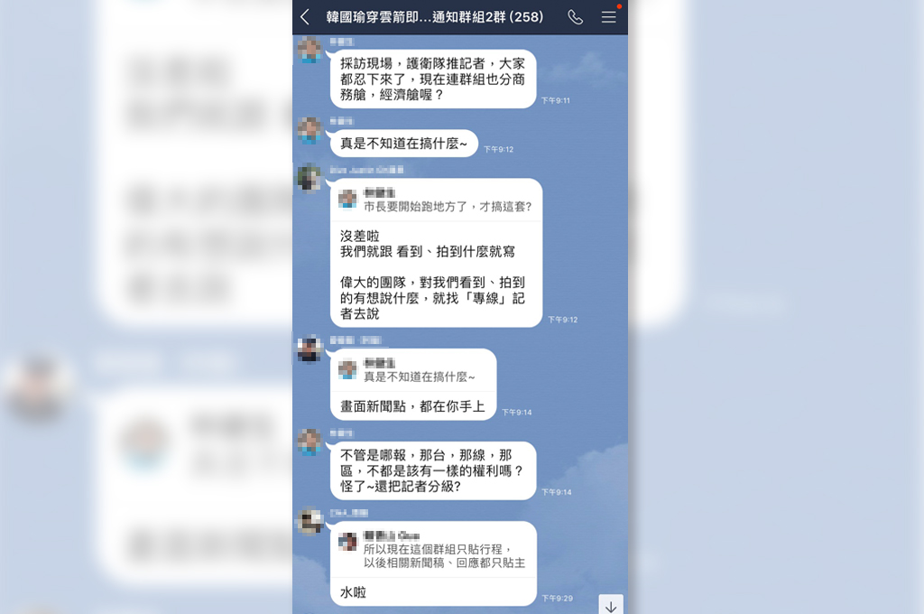 訊息一出,又引來地方記者在群組中直批:「地方記者沒有線,現在市長要開始跑地方了,才在搞這套?」、「中南部都沒有人專跑韓,所以都不用理了?」、「採訪現場護衛隊推記者,大家都忍下來了,現在連群組也紛商務艙、經濟艙?」、「不管哪台、哪報、哪線,不都該擁有相同的權利嗎?怪了,還把記者分級?」