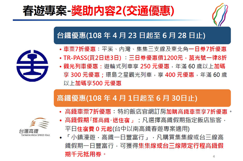 交通部觀光局砸8.6億預算,攜手高鐵、台鐵、中華郵政及中華電信推出優惠,4到6月期間無論住宿、交通、自由行或團體旅遊都有補助。自由行旅客週日到週四住宿每房補助500元,18~40歲青年到離島旅遊、入住小鎮民宿再加碼500元,累計3次最高補助1500元;團體旅遊每團最高補助3萬元,離島、入住星級旅館或企業旅遊可再加碼5萬元;各縣市自行提案,觀光局最高補助1000萬元行銷費。預計可帶進62.5億元觀光效益。