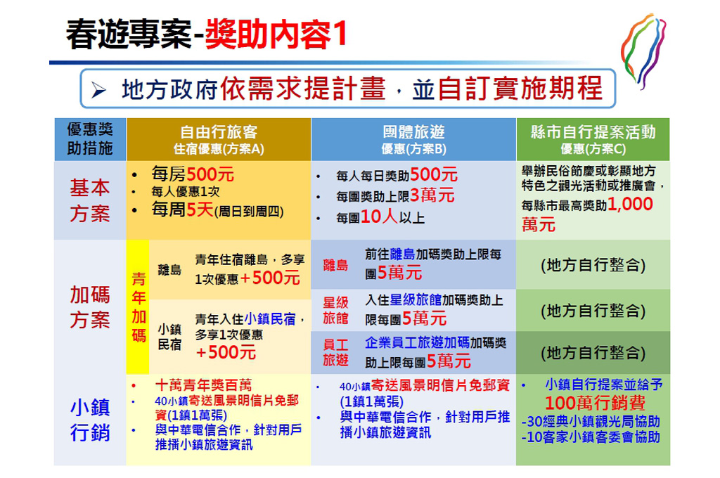 觀光局今(5)日公布春遊專案內容,方案內容分為自由行、團體旅客和縣市自行提案三個套餐,A餐是自由行基本方案,於週日至週四期間,入住參與活動的合法旅宿業,除每人每日獎勵500元外,18歲至40歲青年入住經典、客家小鎮民宿可再加碼500元,以及前往離島地區旅遊住宿也可再加碼500元。
