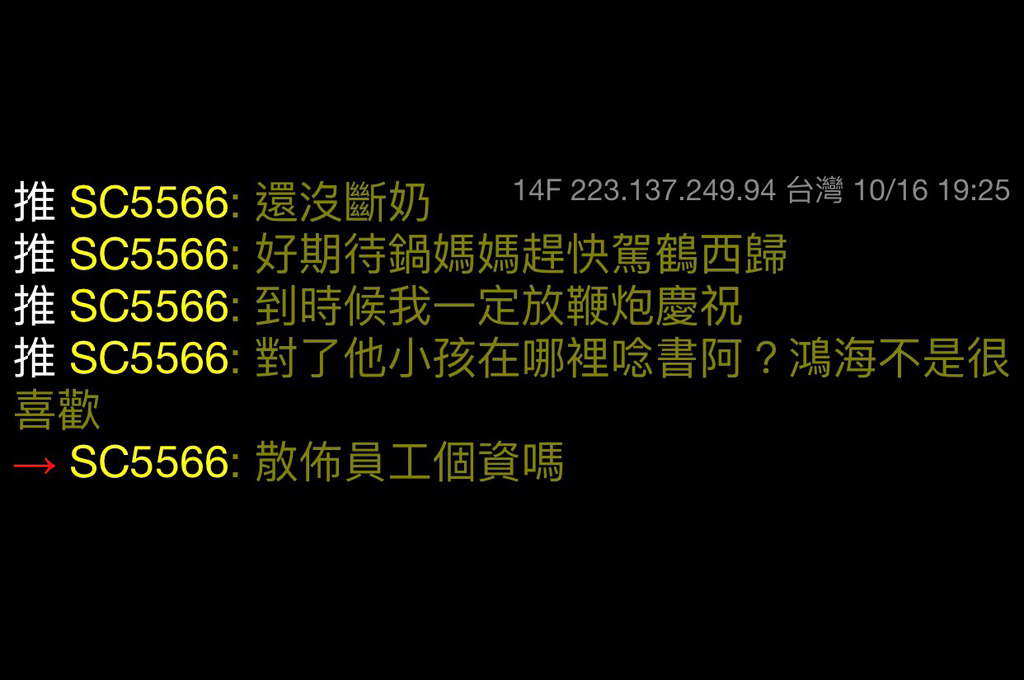 鴻海創辦人郭台銘退出2020總統大選,網路上不堪入目的謾罵字眼不減反增,由於已涉及郭媽媽人身安全「期待郭媽媽趕快駕鶴西歸」,讓郭及其團隊終於忍無可忍。郭辦今(31)日赴刑事局報案,幕僚蔡沁瑜受訪時提到女兒2歲罹癌成網軍攻擊籌碼,哽咽地問:我們活該被欺負?幕僚劉宥彤指出,黑郭言論在郭退選後變本加厲,相信社會不會姑息養奸。