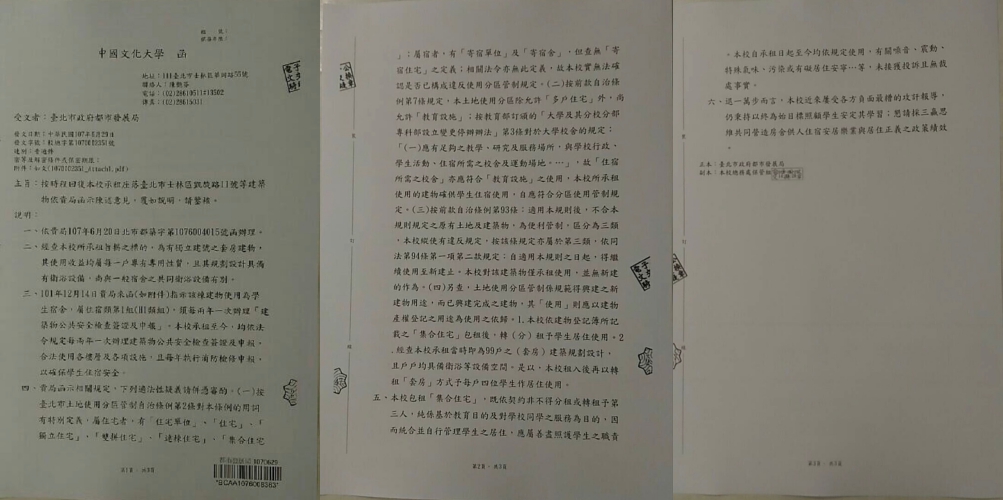這位市議員表示,文大說,86取得使照時符合當時土管規定用途所以不能因為土管後來修改而推翻原合法使用權益。但都發局說明及打臉:土管從86年至今年根本沒有修改過住二特相關内容。所以至始至終都不能做宿舍使用