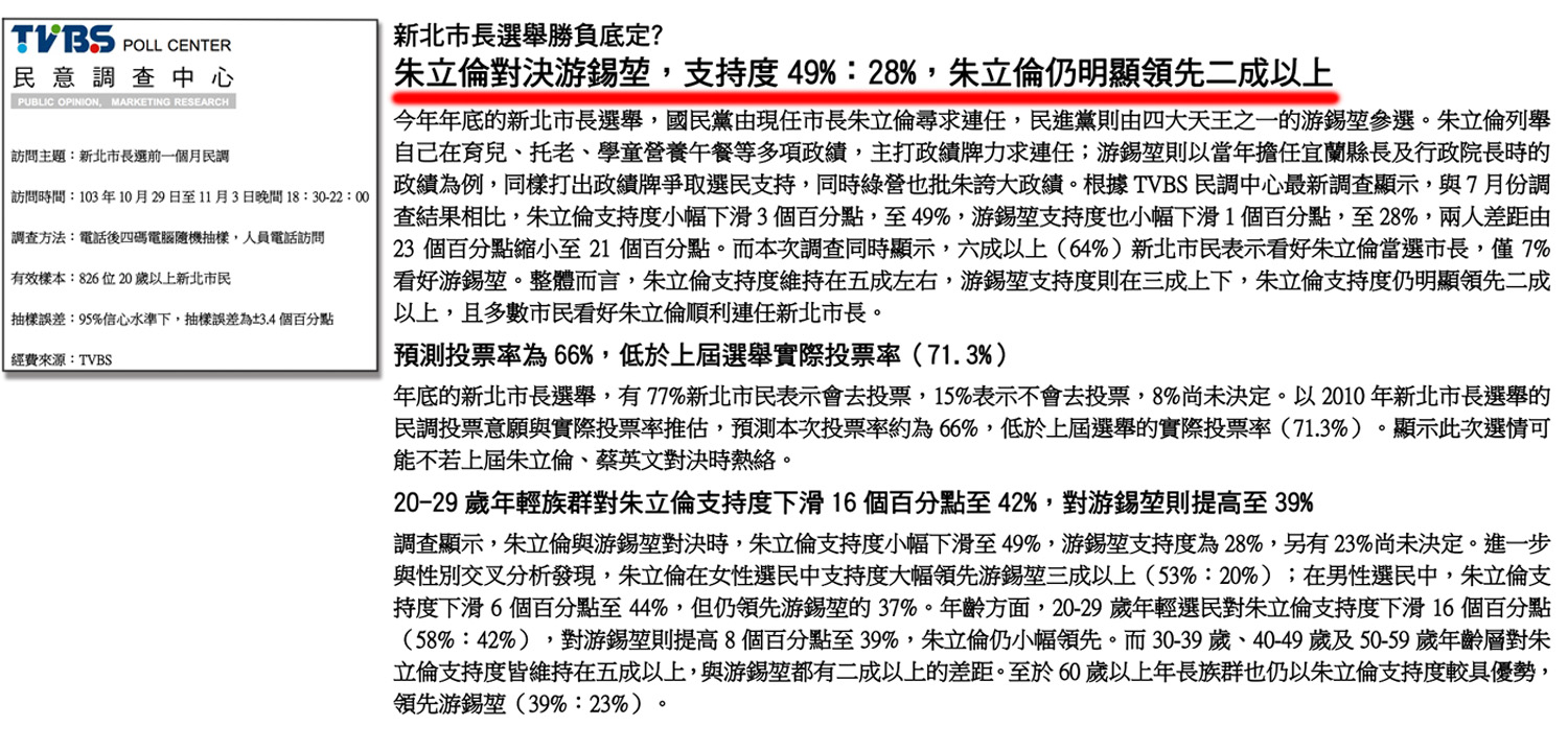 2014年新北市長選舉,TVBS在選前一個月時,所做出的民調,朱立倫對決游錫堃,支持度 49%對28%,朱立倫明顯領先20%以上,這是在2014年11月3日所完成的民調。
