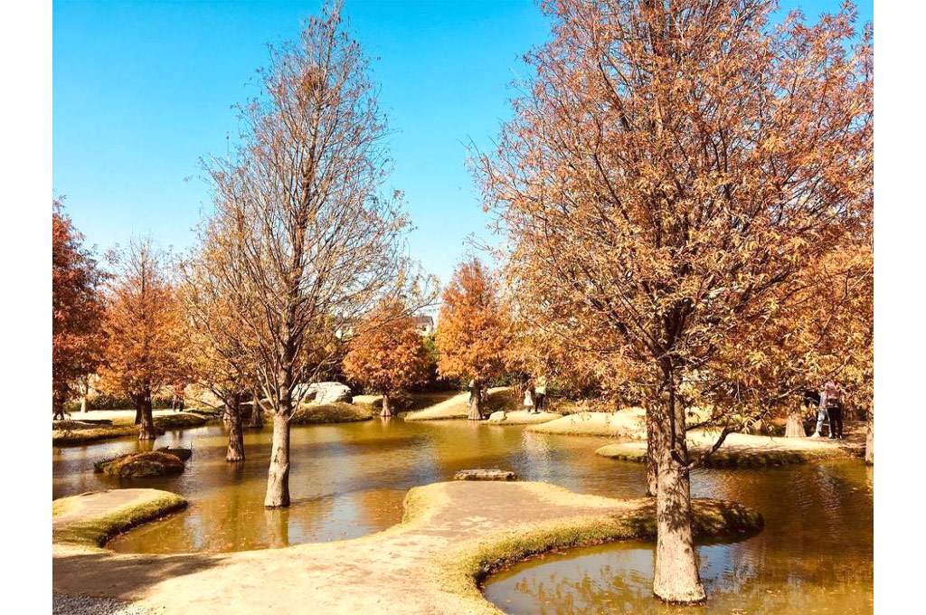 這裡跟其他城市相較之下特別的點是旁邊有水圳、所以構圖中不只有落羽松林,水圳加入後畫龍點睛~使整個畫面更唯美、彷彿在異國慢步。