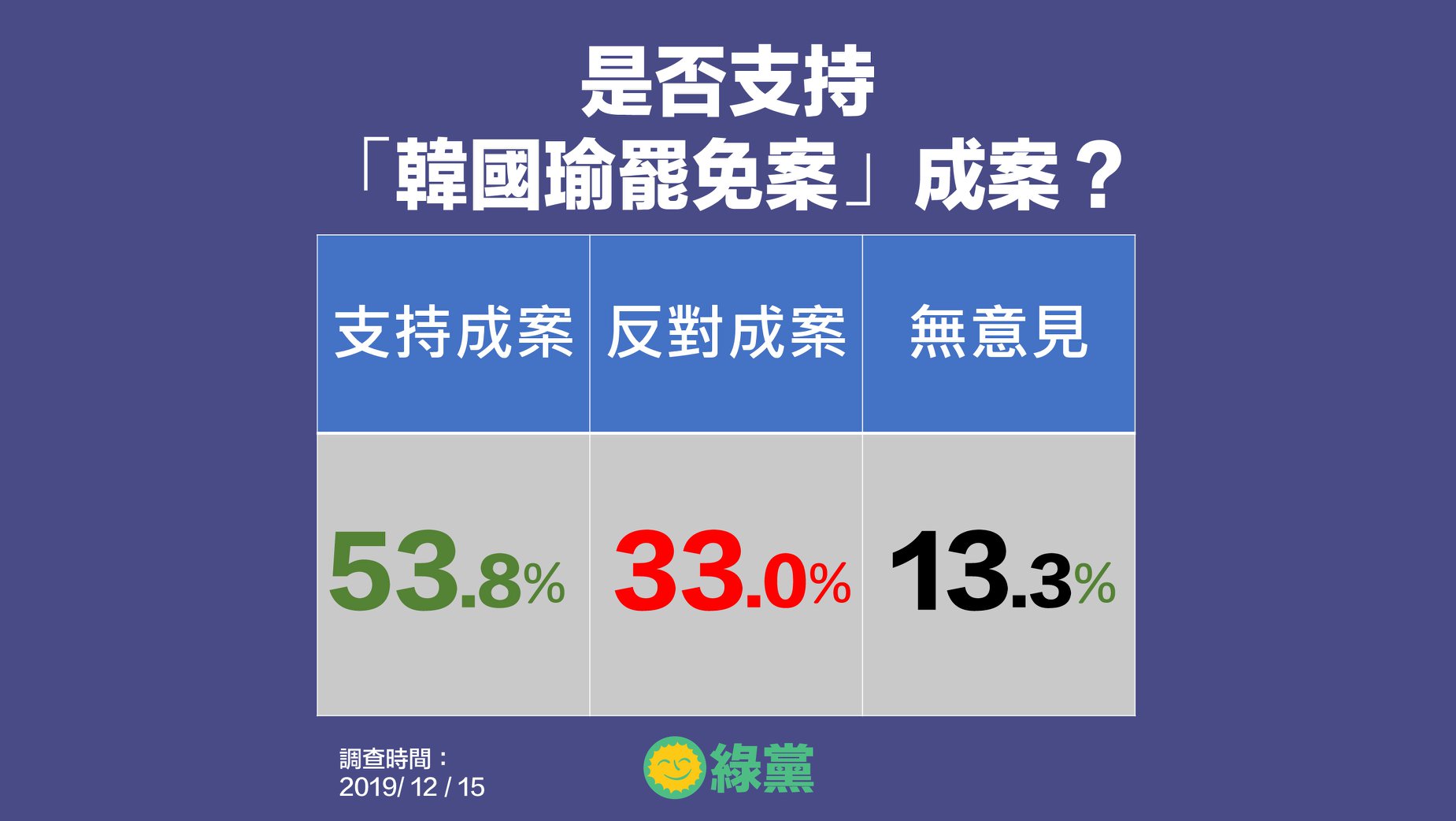 對於明年很可能成案的罷免投票,則有高達53.8%的民眾支持罷免,僅33%反對,若以投票意願、投票率換算,綠黨強調,韓國瑜恐怕將遭到總統、市長雙殺,成為中華民國史上第一個被罷免的直轄市長。此次調查由綠黨委託山水民調於12月15日針對高雄市20歲以上成年人調查並經區域、性別、年齡加權,成功訪問1009位市民,在95%的信心水準下抽樣誤差為正負3.09個百分點。