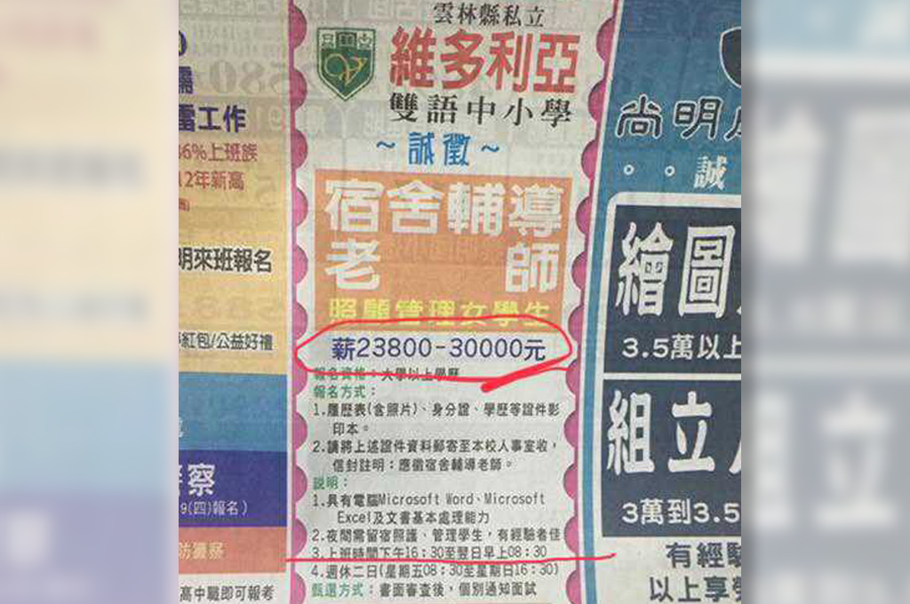國民黨總統候選人韓國瑜與夫人李佳芬合辦的私校「維多利亞雙語中小學」,每年學雜費超過60萬元。該校昨(5)日卻在批踢踢上遭爆料,近日在報紙、人力銀行上徵聘「宿舍輔導老師」,薪資範圍2萬3800元至3萬元之間,上班時間從下午4點半到隔天早上8點半,時數竟長達16小時。