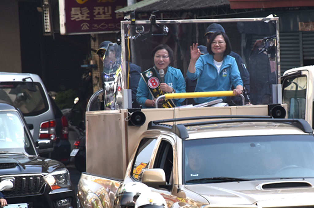 不只在路口等待小英的民眾,也有行經的汽機車駕駛,利用紅燈時間搖下車窗讚聲,還有開天窗伸手狂揮競選旗的支持者,都再再顯現小英高人氣與魅力。