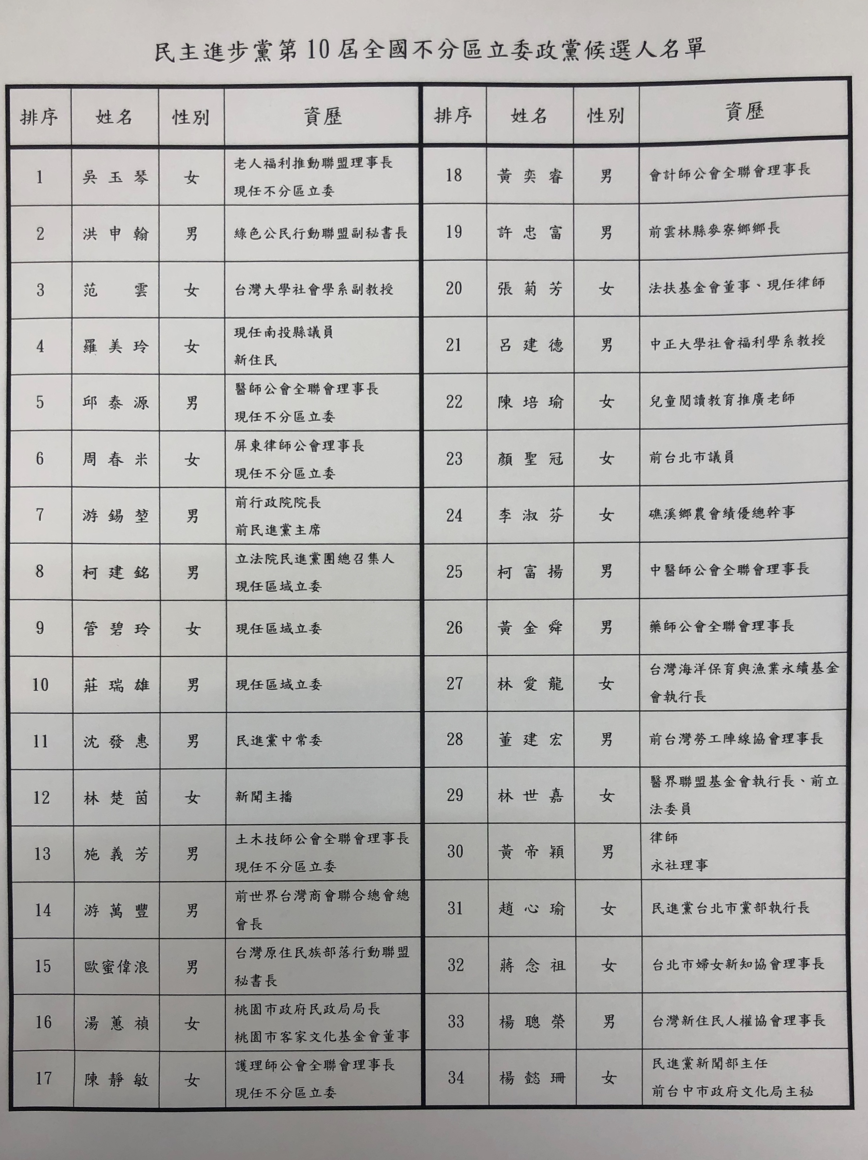 (民進黨第10屆全國不分區立委名單,第33名楊聰榮因個人因素已退出)