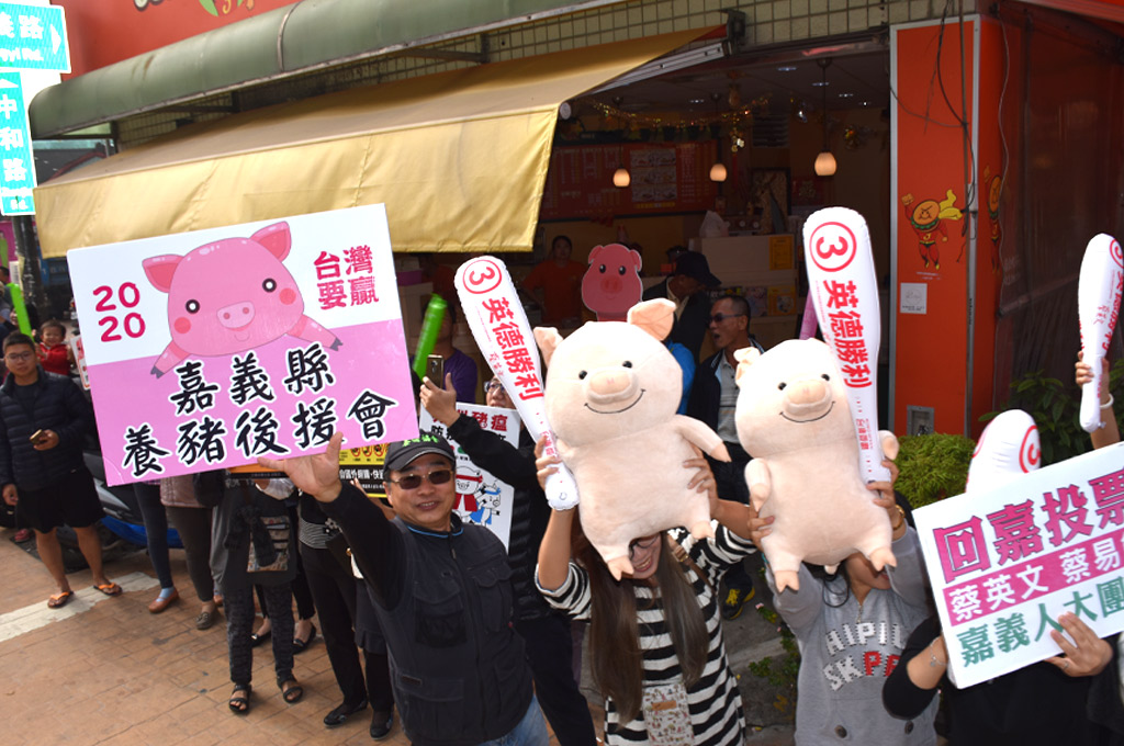 小英在嘉義陪同立委候選人蔡易餘掃街時,有人舉著台灣加油、綠能產業挺小英、護國保豬的牌子為小英加油打氣,也顯示了蔡政府政績讓民眾有感。