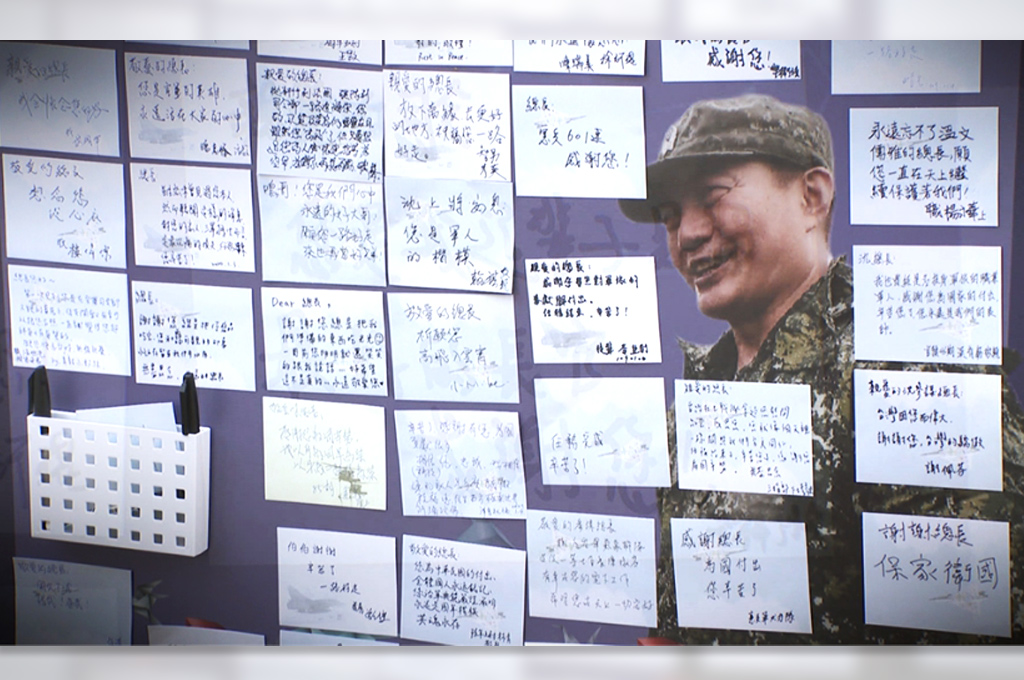 國防部長嚴德發今日下午再度赴台北賓館追思,並在每一位將士看板前貼上便條紙,表達追悼之意。
