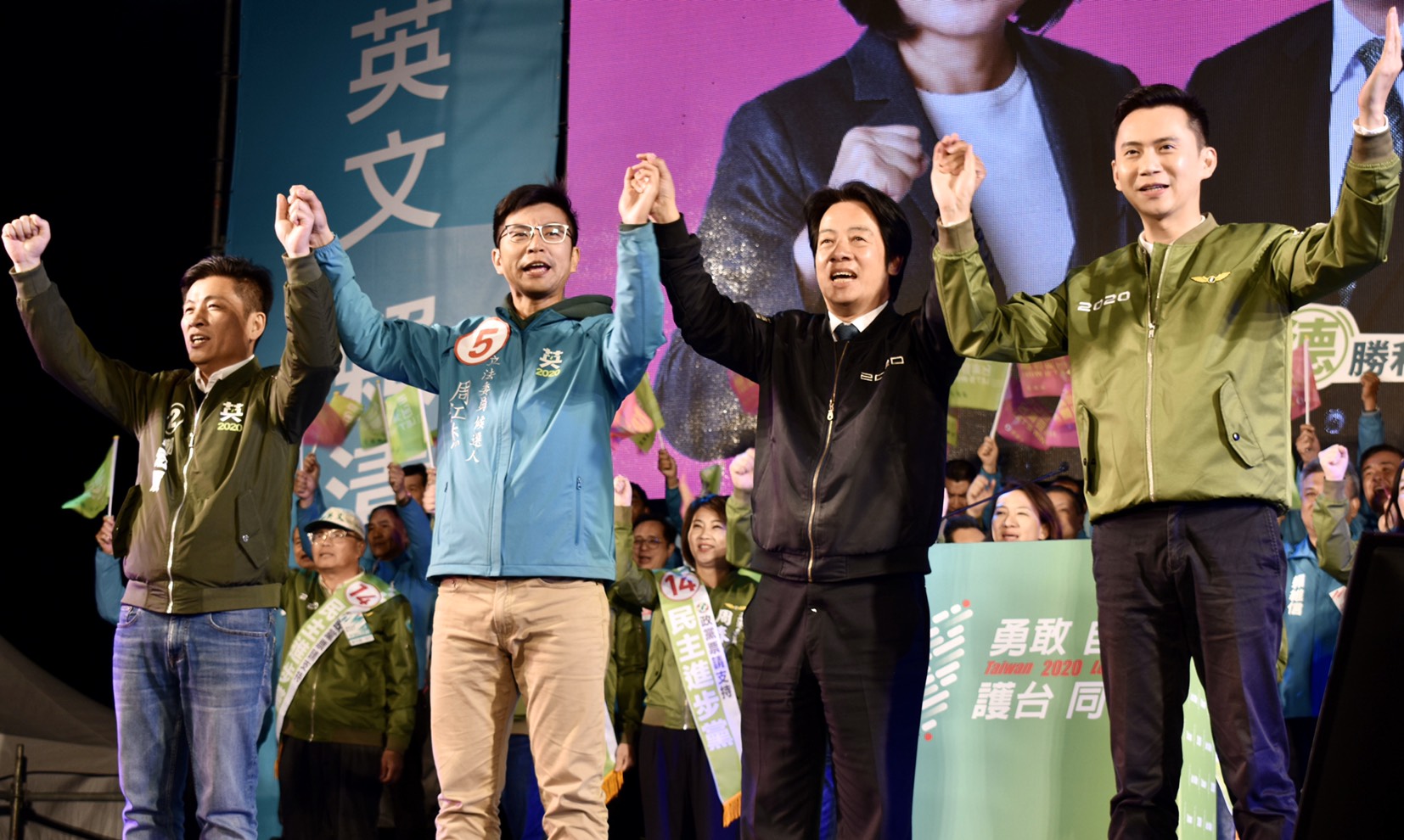2020總統暨立委大選將至,總統蔡英文「勇敢自信、護台同行」車隊掃街大拜票今(8)日早上從彰化一路挺進苗栗,晚間則在新竹舉辦造勢晚會。民進黨副總統候選人賴清德也特地從南部驅車趕上,致詞時聲音已經沙啞,他表示,民進黨這次政黨票號次14,代表的意義正是天公伯賜給民進黨守護台灣「一世的工作」。