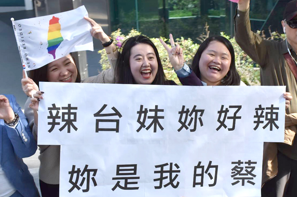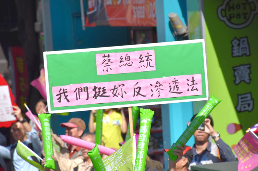 蔡英文今(10)日進行全台大車掃最後一天,上午襲捲土城板橋。小英自備板子大撩選民外,英粉也以創意標語大喊支持,更有人高舉「我們挺妳反滲透法」,傳達認同總統守護主權、力抗中共的決心。