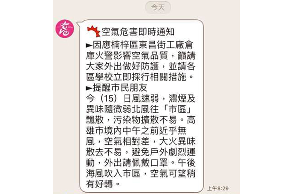 高雄市楠梓區今(15)清晨6點有衣物原料廠房發生大火,濃煙污染隨北風飄往市區,遠及小港都聞得到煙臭味。雖然高雄市政府在早上8點29分在官方Line群組發佈空氣危害通知,但民進黨立委趙天麟批評,法律規定是要透過有線電視及廣播公告周知,也質疑「市長聲量大,也可以直播告知民眾該如何應處,但人呢?」;高雄市長韓國瑜則在10點41分時才上傳錄製好的影片至新聞局媒體群組,報告後續處理狀況,呼籲市民注意空氣污染。