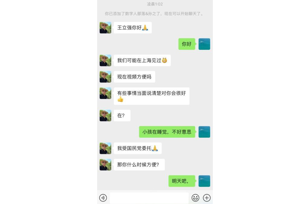 根據最新曝光的對話截圖,中國商人孫天群主動私訊王立強,提及兩人可能在上海見過面,要求視訊通話把事情當面說清楚,王立強以小孩在睡覺為由拒絕通話,孫天群隨即表明自己是「受國民黨委託」;此外,也提供錄影完整劇本給王立強。