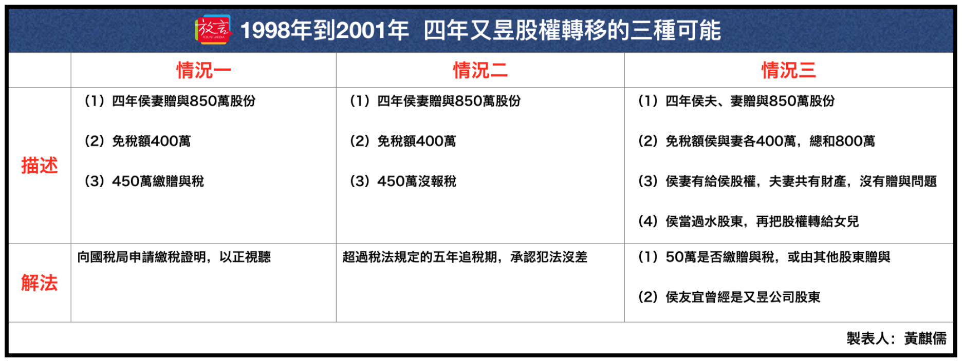 1998年到2001年,侯家要移轉又昱公司股權給三個子女,有三種可能的做法,整理成表如下。