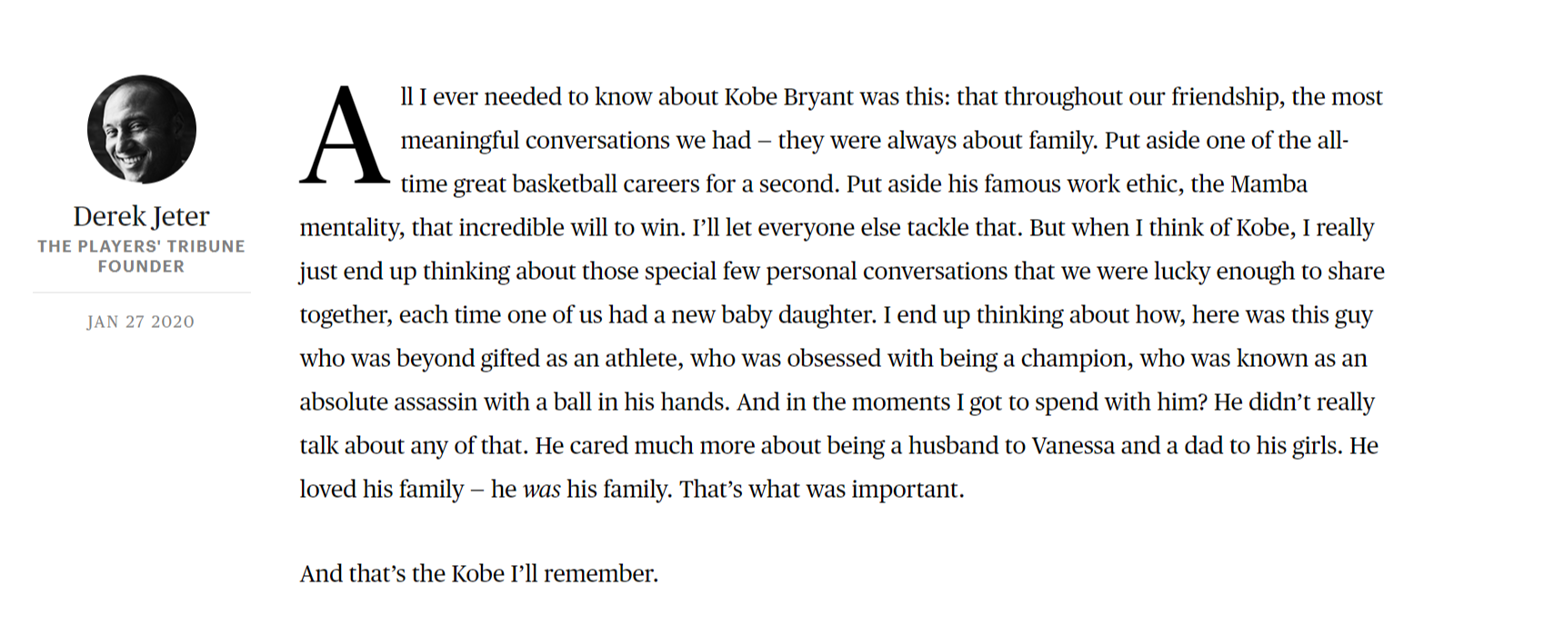 NBA傳奇球星Kobe Bryant與13歲女兒Gianna Bryant墜機驟逝,「洋基隊長」基特(Derek Jeter)得知噩耗後,撰寫了一篇長文紀念Kobe,描繪基特記憶中與Kobe友誼中,談話中最重要、最具意義的討論就是關於家庭,「我看過這個人拿下81分,我看過他投進所有的絕殺球,我看過他拿下金牌以及冠軍戒指,但在這些場合當中,他都沒有與家人相處時看起來那麼開心。」
