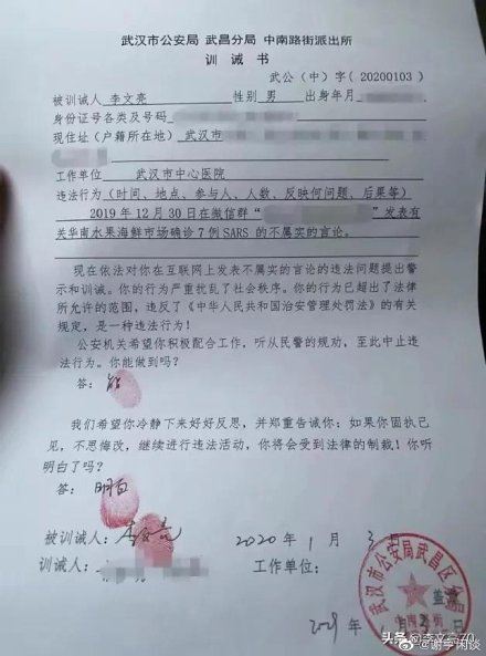 李文亮發文回憶,去年12月30日,看到一份病人的檢測報告,檢測出SARS冠狀病毒高置信度陽性指標,基於醫生的角度,當然提醒社會注意疾病防護,同時在群組裡表示「確診了7例SARS」。豈料,訊息發出後,公安局竟然在1月3日就找上李文亮,並強制要他簽結訓誡書。