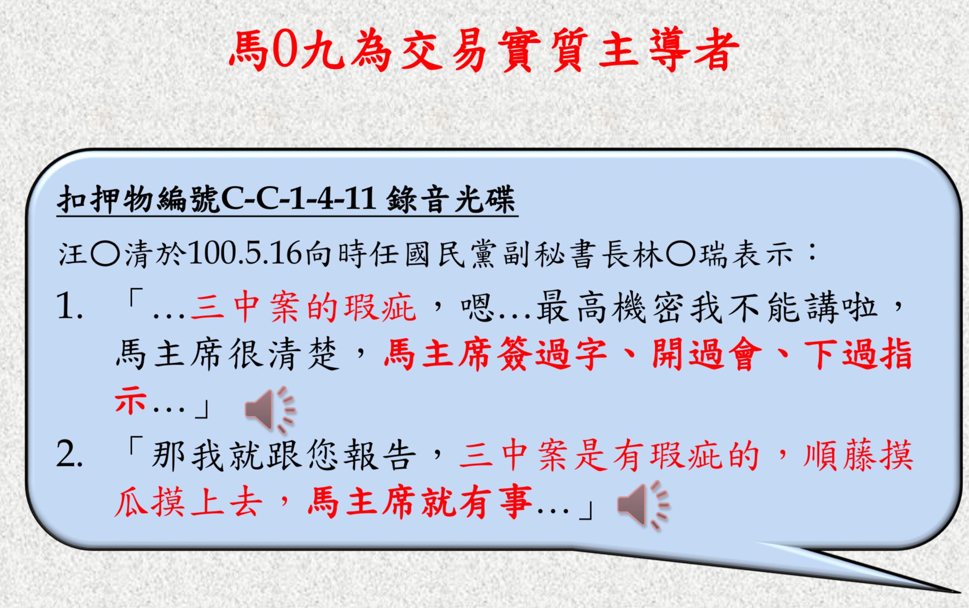 地檢署今日為了三中案起訴馬英九,不只發布新聞稿,還準備非常充足的圖表資料和光碟。從資料中可以看出從頭到尾,馬英九明知余建新財力不足,還硬是賣給他,被時任國民黨秘書長詹春柏批評「這很荒唐」、「這會不會有一點買空賣空而且詐賭的方式...」,馬最後甚至圖利對方,和手下配合撰寫「天龍八步」手稿,被認為是掩飾犯行、一手遮天,以利逃避外界追查,簡直匪夷所思!
