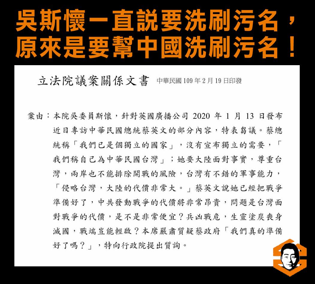 曾在中國出席活動時,起立聽中共國歌與聆聽習近平致詞的國民黨不分區立法委員吳斯懷,今(19)天陸續被陳柏惟、林昶佐揭露他首次質詢的內容,竟是質疑總統蔡英文強化國防是在挑釁中國。