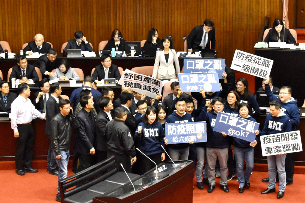 立法院新會期今(21)開議,在立法院長游錫堃宣讀審議過程時,國民黨立院黨團率38席立委齊聲高呼:「口罩之亂何時了!防疫照顧假給六成薪!」