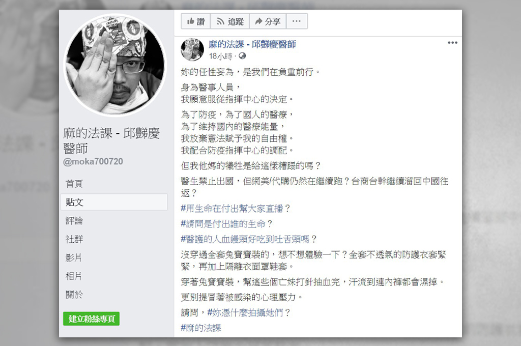 醫師邱豑慶經營臉書粉絲專頁「麻的法課 - 邱豑慶醫師」,昨日(23)晚上突然發文開砲:「我他X的犧牲是給這樣糟蹋的嗎?醫生禁止出國,但網美/代購仍然在繼續跑?台商台幹繼續溜回中國往返?」,文中提及身為醫事人員即服從指揮中心宣布醫事人員不得出國的決定,並附上某位網美代購的臉書截圖。