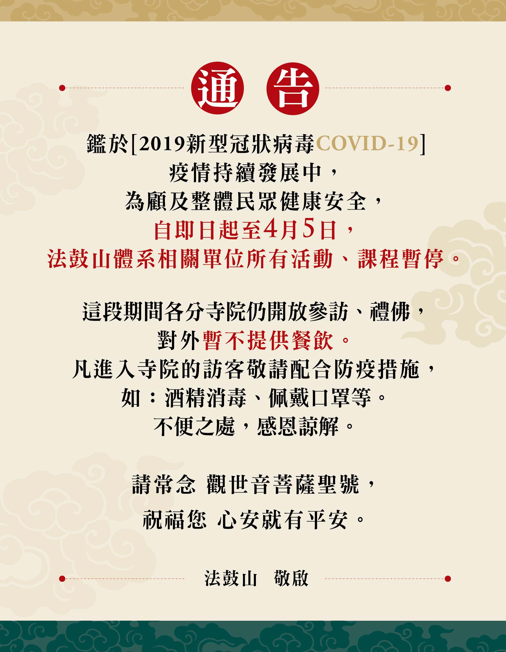 法鼓山也在官網公告,為顧及整體民眾健康安全,相關單位所有活動、課程、共修、禪修營,都從即日起暫停至4月5日。