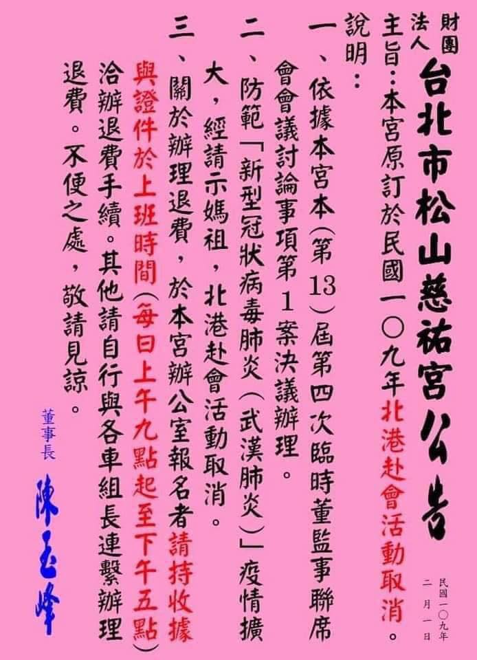慈濟公傳處同樣宣布,從2月1日起已取消或延後共修、研習、海外訪賓參訪等大型活動,預定暫停至3月底,並視疫情狀況調整。