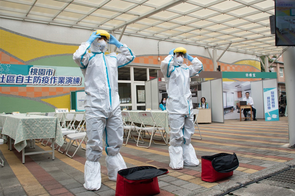 鄭市長表示,防疫視同作戰,市府超前部署朝向備災、減災的方向走,透過社區自主防疫演練,降低民眾社區感染風險,強化社區緊急應變能力。在醫療端,目前衛福部桃園醫院及11家責任醫院皆已提早進行防疫部署,桃園醫院及林口長庚醫院已實施探病管制,降低醫療人員的壓力。