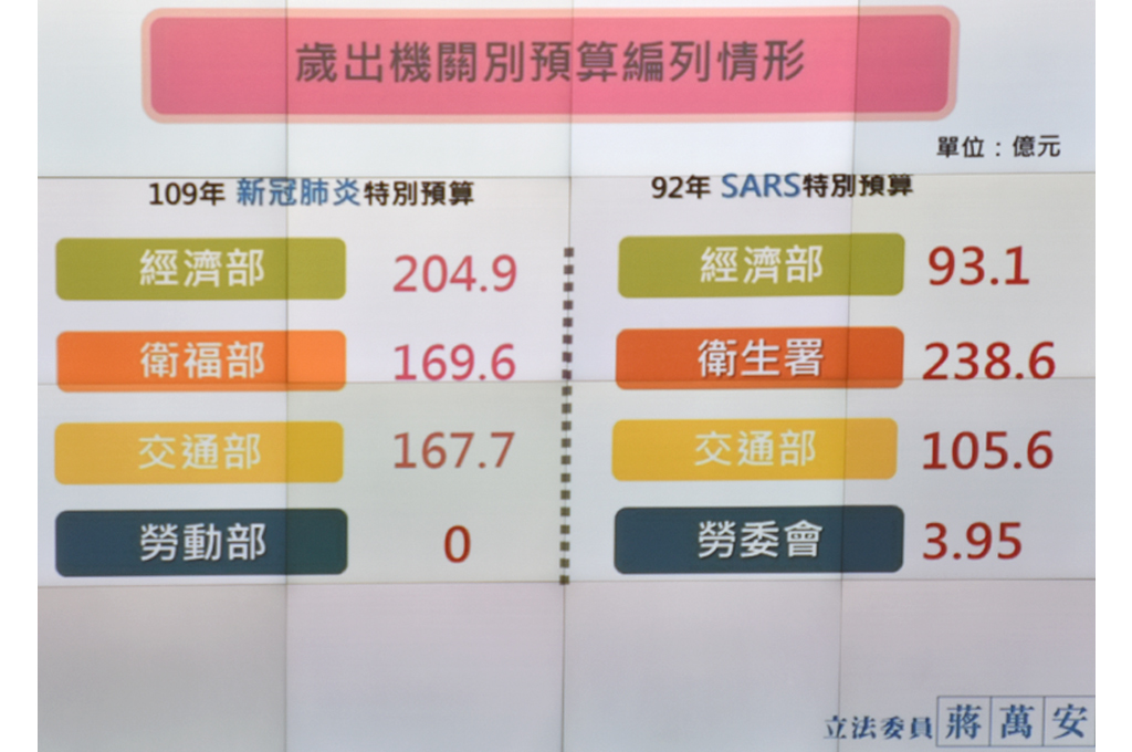 「勞動部在這次特別編列預算裡,經費是零!沒有編列任何經費?」蔣萬安難以接受,激動地說:比較92年SARS的時候,當時佔比預算最高的,一樣是這次的前三個部會,「但是當時勞動部也有編列3億9千多萬,將近4億的經費;包括受隔離者的工資補貼,還有做勞動場所的專案檢查,也就是確保勞工的工作場域、環境安全跟衛生。」