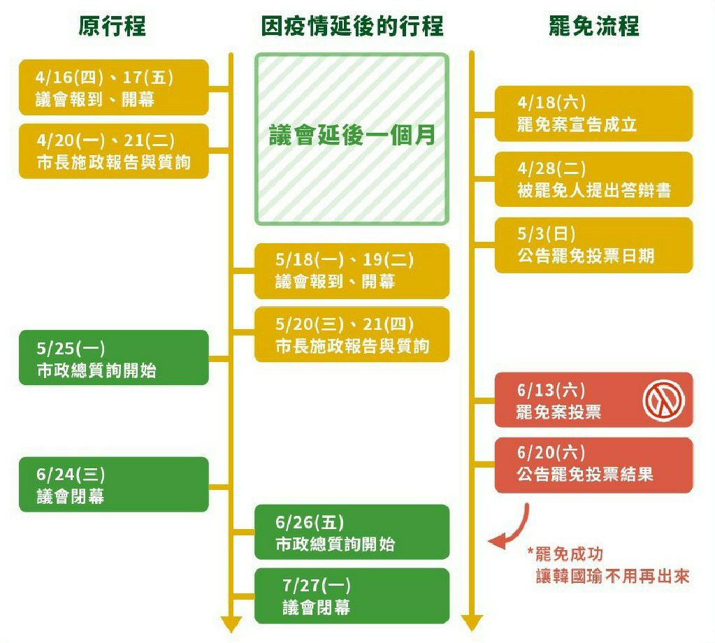「原本施政報告訂於4月20日,總質詢於5月25日,這都是國民黨主導的程序委員會排定的,結果發現剛好在六月罷免投票前。韓國瑜想改又怕被說話,想請假但不敢,碰到疫情,這下好了,利用疫情理由,延後一個月。」