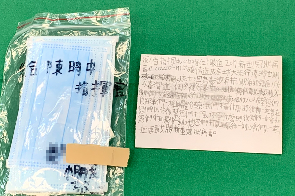 陳時中原已宣布記者會結束了,卻突然從懷中拿出一封信和一袋口罩。他表示,這是南部一位十歲小朋友寄給他的,有親筆寫的信跟花色、大小不一的口罩,換句話說不是一次買起來的。稚氣的字跡配上花色不一的兒童與大人口罩,讓陳時中看了直呼「台灣人真的很可愛!」、「台灣人就是很有心拉!」