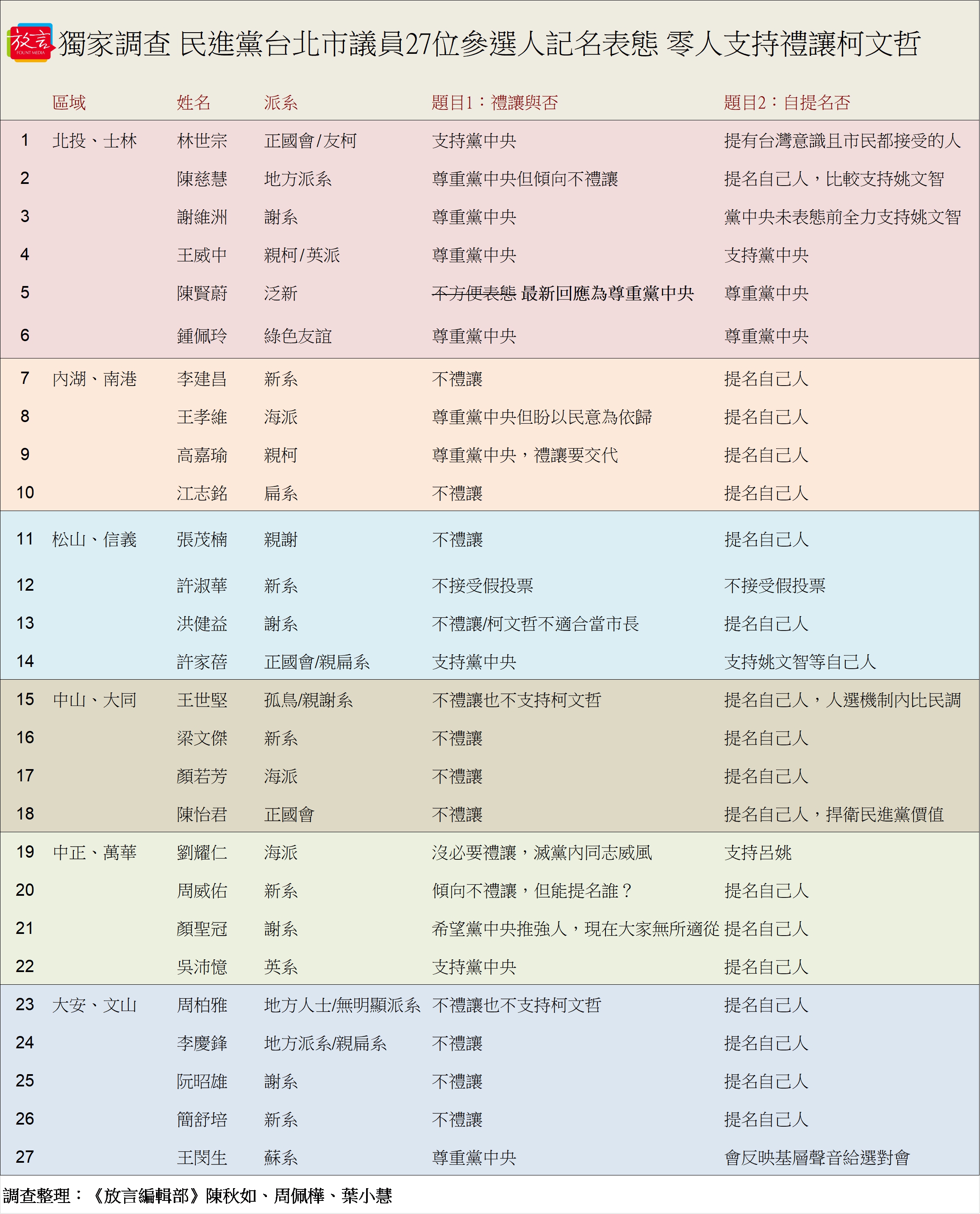 民進黨台北市議員黨內初選結束,放言團隊向通過初選的 27 位參選人,針對「是否支持民進黨禮讓柯文哲」及「是否支持民進黨在台北市提名市長人選」進行記名投票及意見調查,有 16 位表達「不禮讓」立場,9 位表示尊重黨中央決定,但仍希望自推人選,1 位不接受假投票,1 位不表態。