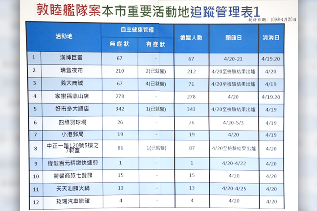 林立人表示,除有出現疑似症狀者之5處場域及今天新增2處,待檢測結果出爐為陰性再同意恢復營業外,其他16處皆可立即恢復營業。