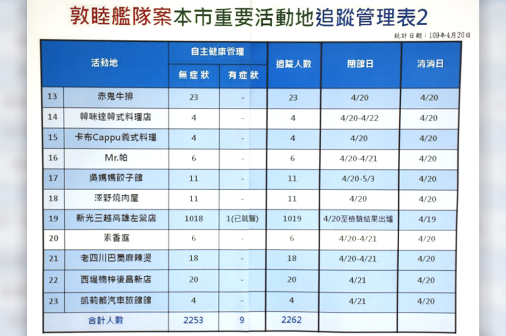 衛生局長林立人補充說明,高雄市此波疫情截至目前總計9名敦睦官兵確診,涉及23處場域,相關接觸者市府匡列2,262自主健康管理,另有1位為密切接觸者居家隔離。