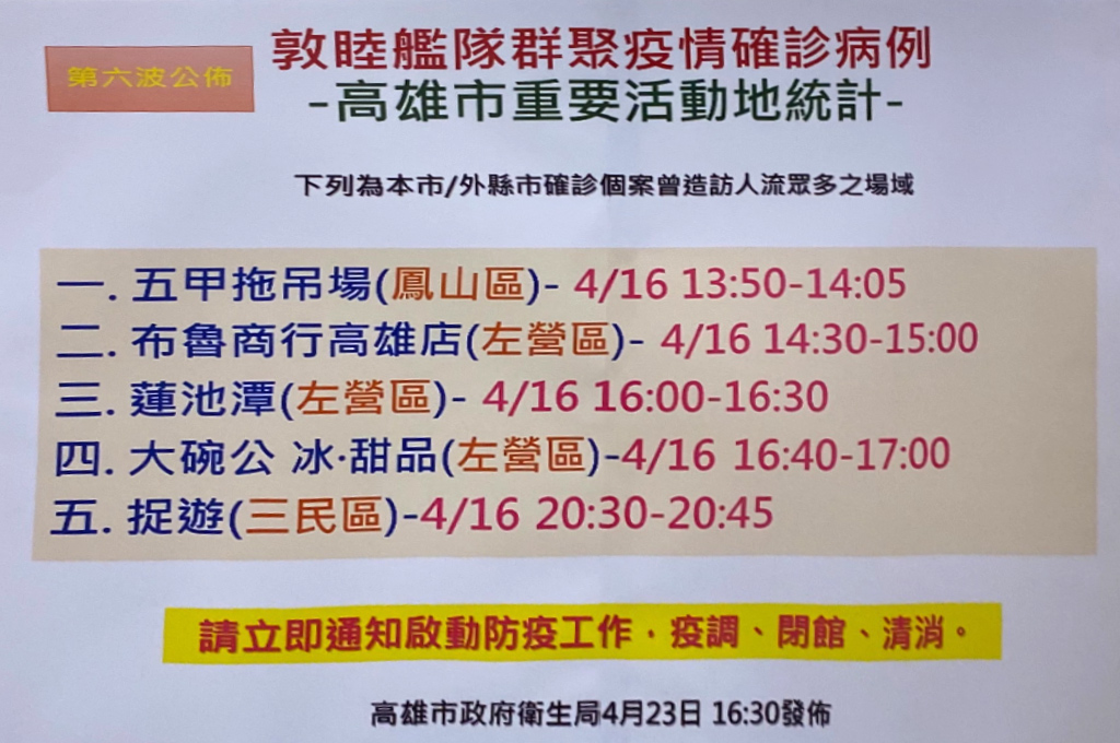 另今日高雄新增確診案例曾活動之風險場域,包括鳳山五甲拖吊場、左營蓮池潭、左營布魯商行、左營大碗公冰店及三民區捉遊共5處熱點。