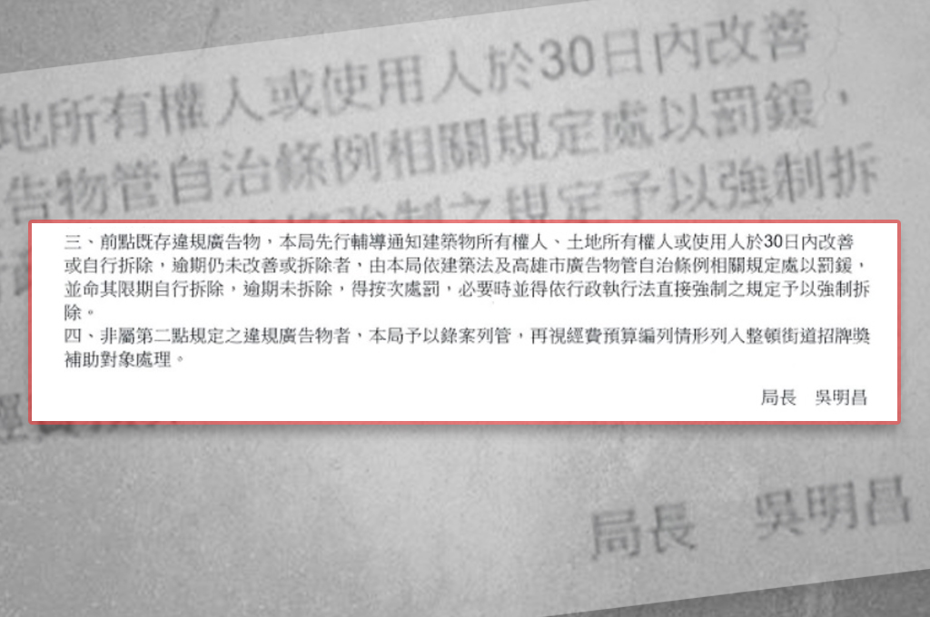 怎樣的狀況下,高雄市工務局可以直接火速拆除呢,其實在《高雄市廣告物管理自治條例》第二十三條寫得很清楚: