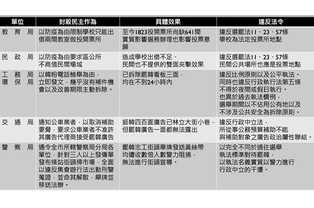 高雄市長韓國瑜罷免案在即,韓市政府近來動作頻頻,遭疑公然插手選舉看板、議會質詢、罷免選務。Wecare高雄發起人尹立今(5)早披露,近期韓市府對他們的壓迫,包括公車廣告、站路口、掃市場都相繼遭交通局、警察局阻擋,質疑「高雄戒嚴了嗎?」新聞局長鄭照新則說明實情,駁斥相關指控是「無中生有」。