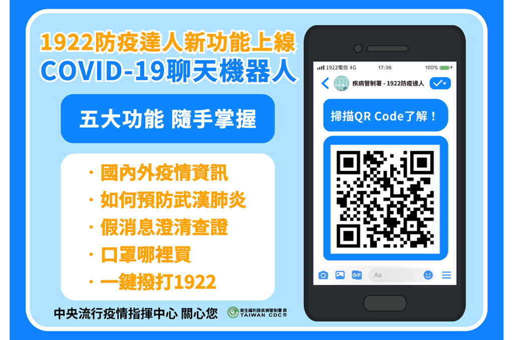 在疾管署Facebook粉絲專頁的貼文底下,或是在觀看每日記者會直播時,留言「台灣加油 一起正向防疫!」將被導向疾病管制署的 Messenger 帳號。可查詢「查看國內外疫情」、「預防COVID-19」、「口罩哪裡買」、「假消息澄清區」以及「撥打1922」。