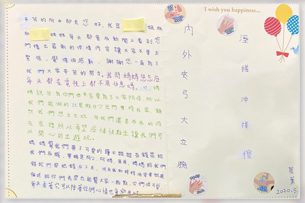 「我問媽媽您怎麼每天都在電視上,都不用休息嗎?媽媽說因為你們很辛苦為了大家防疫,所以我們能做的就是假日少出門要待在家裡,雖然我們想出去玩,但我們還是乖乖的待在家裡,所以希望疫情快點走,讓我們可以開開心心的出遊玩。」
