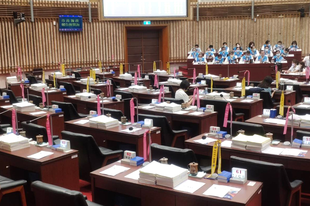 高雄市長韓國瑜罷免案在即,今天的市長施政報告質詢,罷免議題不免成為焦點,除了質詢過程中的口頭攻防,藍綠議員也透過絲帶、口罩、手舉牌等各種宣傳品表態。