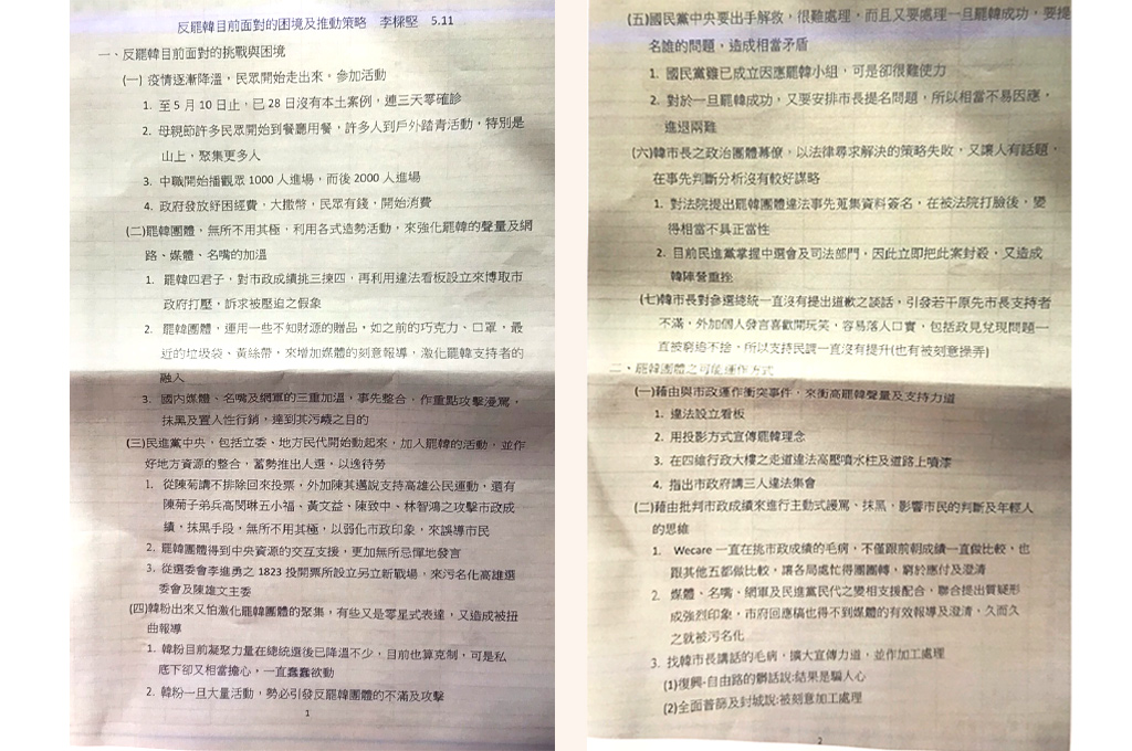 韓營反罷免策略書曝光!一份註明5月11日、署名高雄市財政局長李樑堅的《反罷韓目前面對的困境及推動策略》外流,就反罷韓目前面對的困境、罷韓團體可能的運作方式及如何因應作出各項分析與沙盤推演。