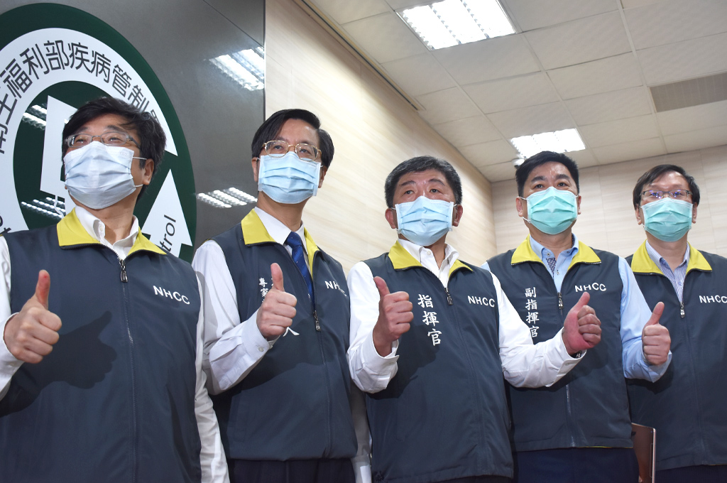 在指揮中心指揮官陳時中、疫情監測組組長周志浩、專家諮詢小組召集人張上淳、副指揮官陳宗彥,以及發言人莊人祥發言人等陪同下,蔡英文在疾管署待了半個多小時後,笑盈盈走出指揮中心。