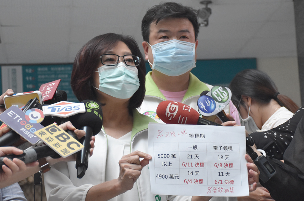 康裕成拿出「等標期」的比較表格指出,5千萬以上的招標案查核時間較長,一般領標須21天,6月11日才決標;就算用電子領標也要18天,6月8日決標,都在6月6日以後。高市府為此將公布金額變為4900萬,再用電子領標,查核時間壓縮到只須11天,6月1日就可決標。