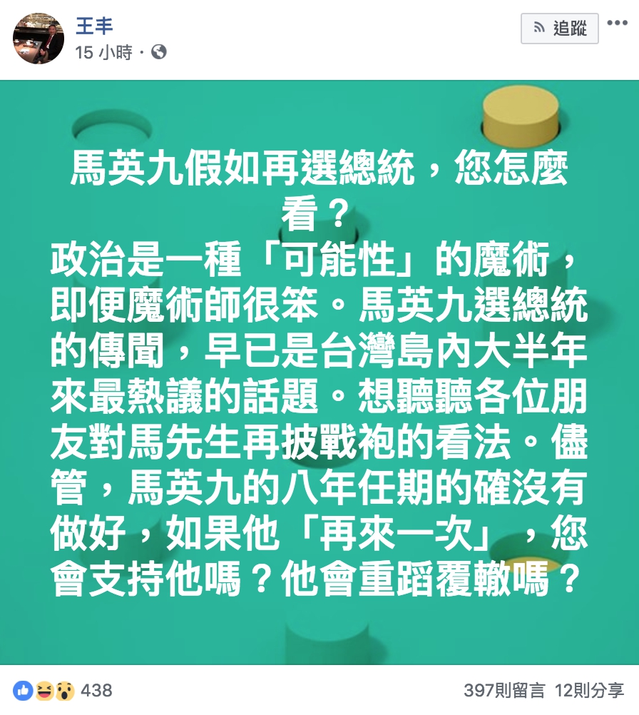 王丰臉書提到關於馬參選2020的傳聞,早已是「台灣島內大半年來最熱議的話題」,想一聞網友對於馬「再披戰袍」的想法,「儘管,馬英九的八年任期的確沒有做好,如果他『再來一次』,您會支持他嗎?他會重蹈覆轍嗎?」